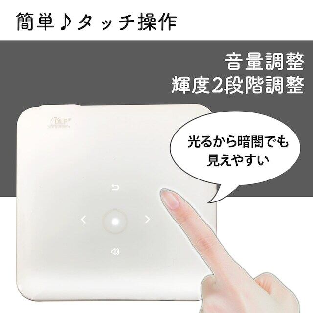 ●コントラストコントラスト美に優れたDLP方式を採用 本プロジェクターは映像を色彩豊かに美しく演出できるDLP方式という投影方法を採用しています。 また、本製品のDLPランプの寿命は約30,000時間と非常に長く、電源オンですぐに使えてランプの耐久性も高いのが特徴です。 メンテナンスフリー仕様となっており、長くお使いいただけます。 ●Wi-Fi接続で手軽にミラーリング スマートフォンやタブレットとWi-Fi接続することでスマートフォンの画面を手軽にミラーリングできます。 YouTubeなどお気に入りの動画を大画面でお楽しみいただけます。 ※AndroidデバイスはMiracast対応の機器のみ対応しています。 ※一部有料動画配信アプリは著作権保護により、正常に出力できない場合があります。 ●超軽量&コンパクトサイズを実現 バッテリーレスのため、重さは缶コーヒーよりも軽く約156g! コンパクトな手のひらサイズとなっており、ビジネスシーンでの持ち運びにも便利です。 また高級感のあるシンプルなデザインでどんなインテリアにも馴染みやすく、出しっぱなしにしても邪魔になりません。 ●直観的でわかりやすいタッチ操作 本体には光るイルミネーションボタンを採用しており、暗い部屋でも見やすく操作ができます。 音量調整や輝度調整が可能です。 ●多機器に対応した豊富な互換性 スマートフォンはもちろん、SwitchやPS5など、様々な機種に対応しております。 本製品を使えば大画面で迫力あるゲームを楽しむことも可能です。 また、USBメモリーやmicroSDカードを本体に差し込めば、写真や動画データを観ることができ、ビジネスシーンでも活躍します。 ●上下反転機能搭載 上下反転機能がついていますので、天井に直付けで吊り下げてお使いいただくことも可能です。 さらに、ベッド頭上に取り付ければ、天井へも投影可能になります。 ※それぞれに必要な天吊り金具や可変三脚などは付属しておりません。 ●付属品も充実で購入後すぐに使用可能 高さ●コントラストコントラスト美に優れたDLP方式を採用 本プロジェクターは映像を色彩豊かに美しく演出できるDLP方式という投影方法を採用しています。 また、本製品のDLPランプの寿命は約30,000時間と非常に長く、電源オンですぐに使えてランプの耐久性も高いのが特徴です。 メンテナンスフリー仕様となっており、長くお使いいただけます。 ●Wi-Fi接続で手軽にミラーリング スマートフォンやタブレットとWi-Fi接続することでスマートフォンの画面を手軽にミラーリングできます。 YouTubeなどお気に入りの動画を大画面でお楽しみいただけます。 ※AndroidデバイスはMiracast対応の機器のみ対応しています。 ※一部有料動画配信アプリは著作権保護により、正常に出力できない場合があります。 ●超軽量&コンパクトサイズを実現 バッテリーレスのため、重さは缶コーヒーよりも軽く約156g! コンパクトな手のひらサイズとなっており、ビジネスシーンでの持ち運びにも便利です。 また高級感のあるシンプルなデザインでどんなインテリアにも馴染みやすく、出しっぱなしにしても邪魔になりません。 ●直観的でわかりやすいタッチ操作 本体には光るイルミネーションボタンを採用しており、暗い部屋でも見やすく操作ができます。 音量調整や輝度調整が可能です。 ●多機器に対応した豊富な互換性 スマートフォンはもちろん、SwitchやPS5など、様々な機種に対応しております。 本製品を使えば大画面で迫力あるゲームを楽しむことも可能です。 また、USBメモリーやmicroSDカードを本体に差し込めば、写真や動画データを観ることができ、ビジネスシーンでも活躍します。 ●上下反転機能搭載 上下反転機能がついていますので、天井に直付けで吊り下げてお使いいただくことも可能です。 さらに、ベッド頭上に取り付ければ、天井へも投影可能になります。 ※それぞれに必要な天吊り金具や可変三脚などは付属しておりません。 ●付属品も充実で購入後すぐに使用可能 高さ18cmまで昇降可能な三脚アルミスタンド、約2mの電源延長コードが標準で付属しており、ご購入後すぐにお使いいただけます。 【付属品】 ACアダプター付Type-C電源ケーブル(1.2m)、HDMIケーブル(0.8m)、Type-C電源延長ケーブル(2m)、三脚アルミスタンド、保証書付取扱説明書